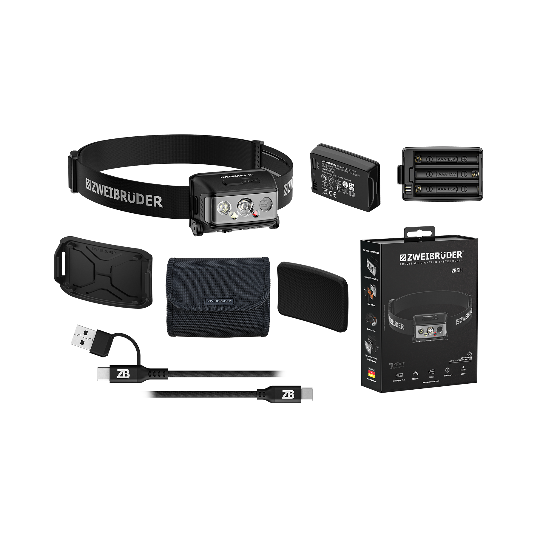 - Zakres dostawy Latarka czołowa ZB5H, akumulator litowo-polimerowy, kabel ładujący USB-C, pojemnik na 3 baterie AAA, uchwyt na kask, podkładka zapewniająca wygodę, pokrowiec